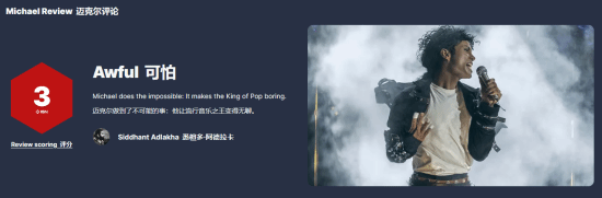 近日,据外媒fandomwire报道,备受全球粉丝期待的迈克尔·杰克逊传记片《迈克尔》首映后口碑遇冷,IGN给出了3分超低评价,烂番茄评分仅32%,创下灾难性开局,与预告片引发的高期待形成鲜明反差,给影片票房前景蒙上阴影。
