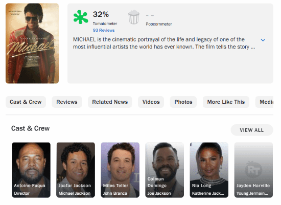 截至2026年4月21日,该片共收获74条影评人评论,烂番茄新鲜度仅32%,影评人普遍表达不满。该片由安托万·富夸执导,格雷厄姆·金与杰克逊遗产共同执行人联合制作,狮门影业负责美国本土制作与发行,演员阵容包括贾法尔·杰克逊、妮娅·朗等,聚焦杰克逊从杰克逊五兄弟时期到上世纪80年代末的个人事业历程。