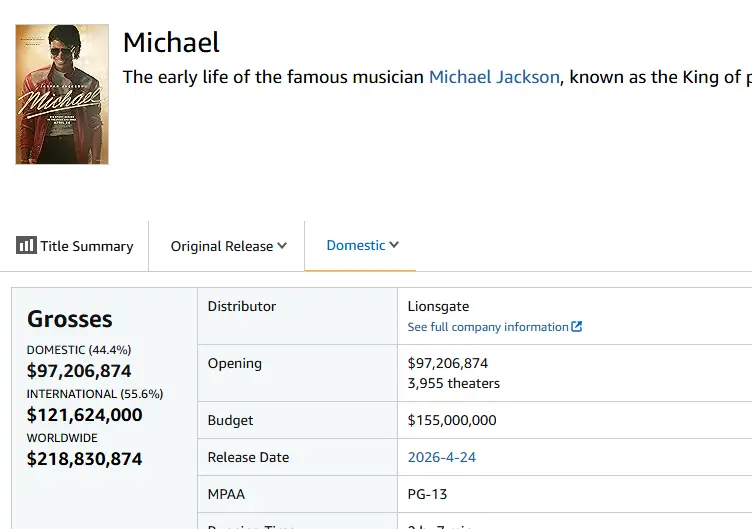 《迈克尔・杰克逊:巨星之路》全球首周狂扫2.17 亿美元票房,创造影史传记片开画最高纪录。
